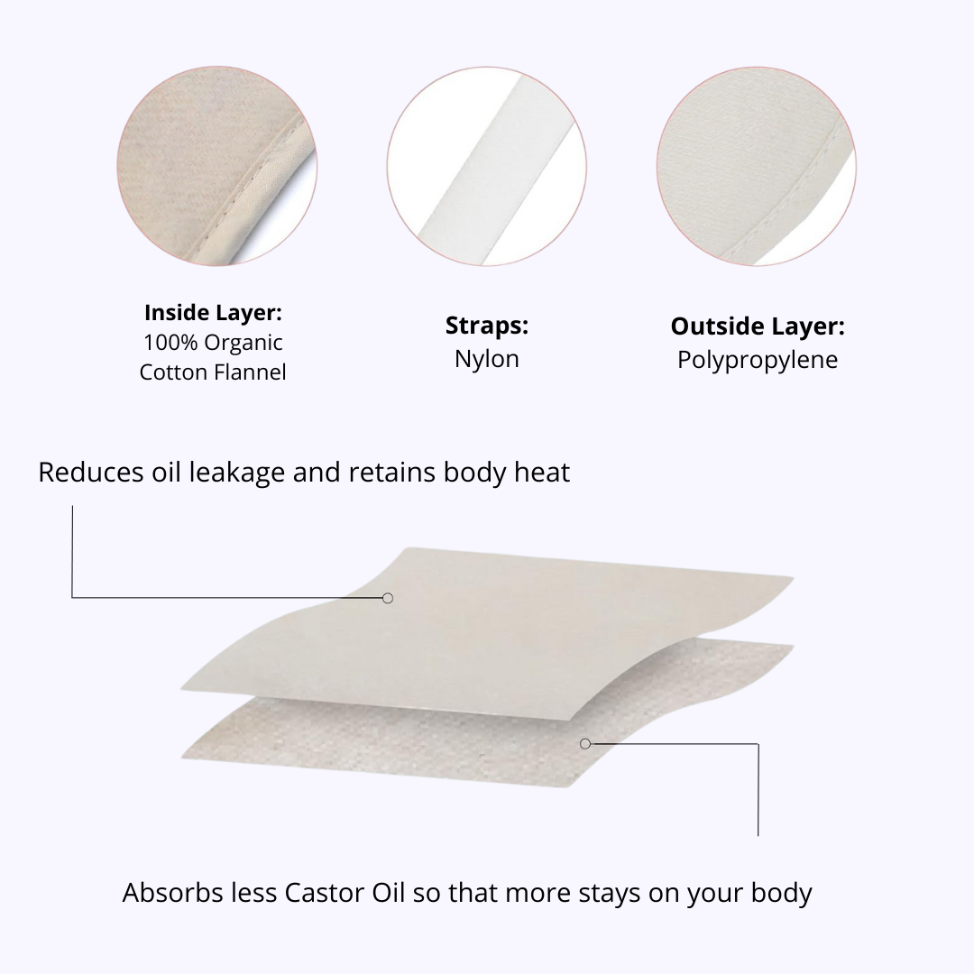 Our pack is essential because It holds warmth by trapping your body heat inside the pack. This allows the castor oil to penetrate deeply into your skin, letting you experience the full benefits of Castor Oil! Without our pack, the oil only absorbs into the surface of your skin, offering little to no benefit.